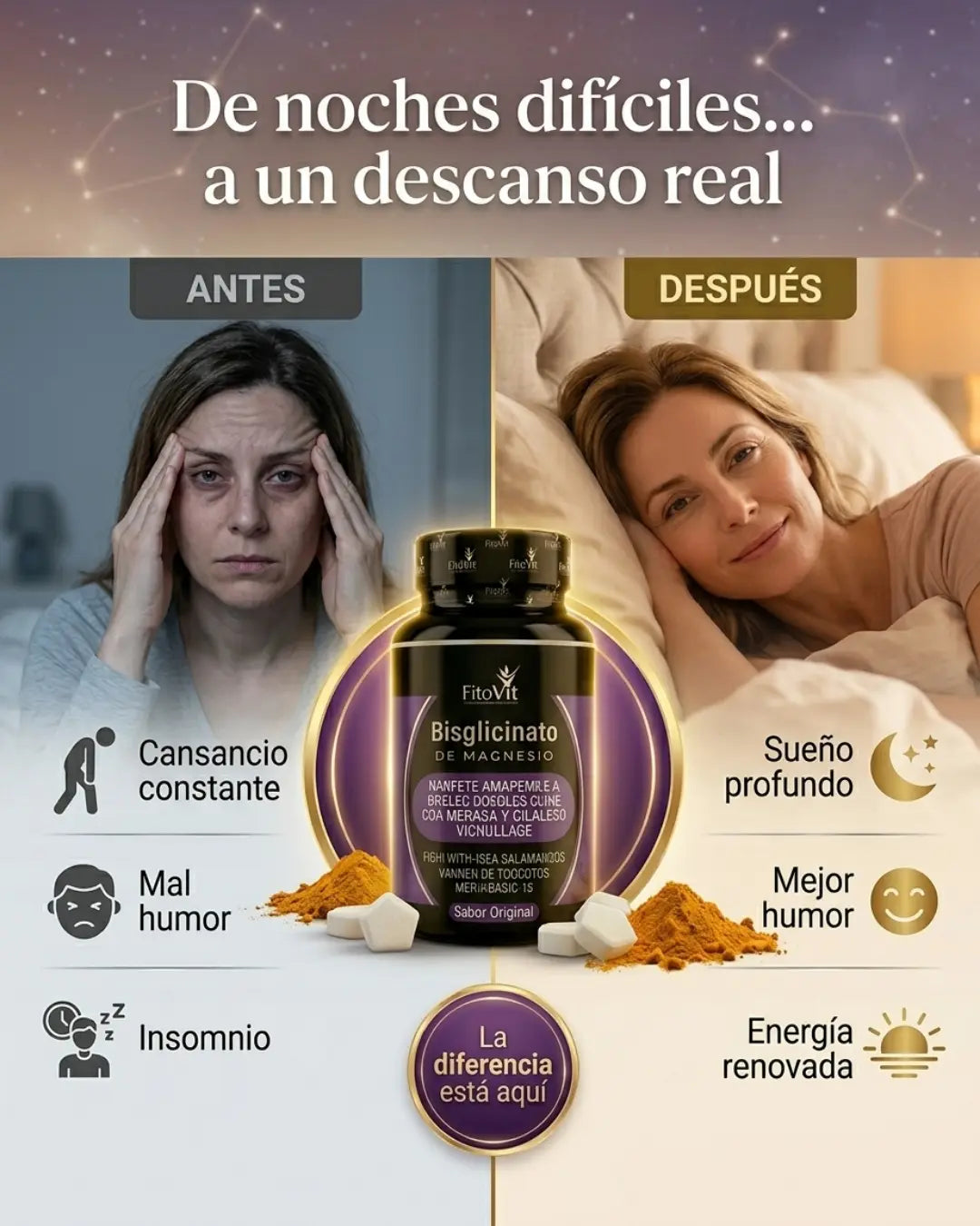 "Sufría de insomnio crónico desde hace años. probe varios menjurjes y mira que este magnesio fue lo único que de verdad me ayudó a calmar la mente y conciliar el sueño sin sentirme atontada al día siguiente"